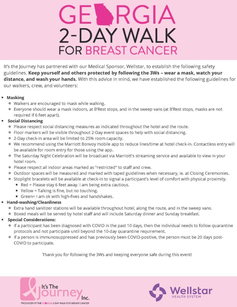 Our medical partners at Wellstar have thoroughly reviewed, advised, and approved all of our COVID safety precautions for the 2021 Georgia 2-Day Walk for Breast Cancer weekend. Please take some time to review the protocols and familiarize yourself with them.