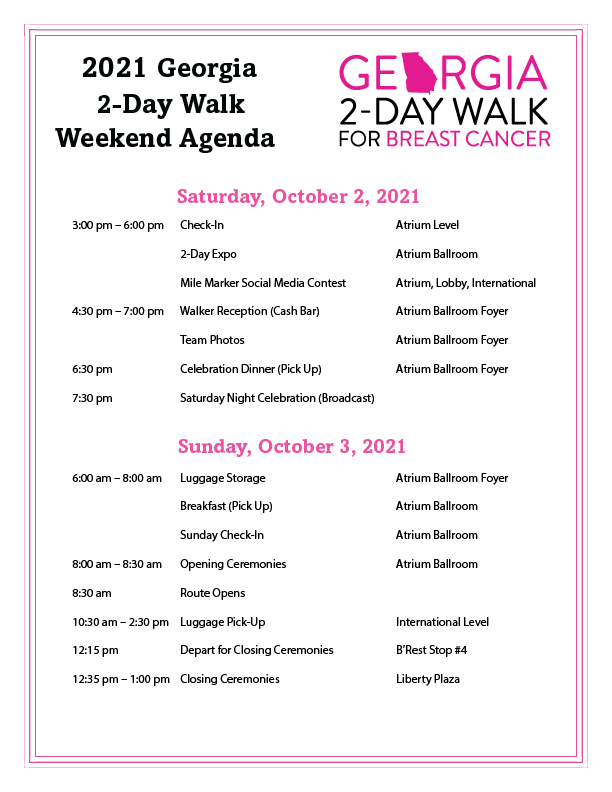 Our new 2021 Georgia 2-Day Walk Weekend Agenda is here! As a reminder, you may still check into your hotel as usual per your reservations, and your shared Saturday night hotel room is still included in all 2-Day walker and crew registration fees.